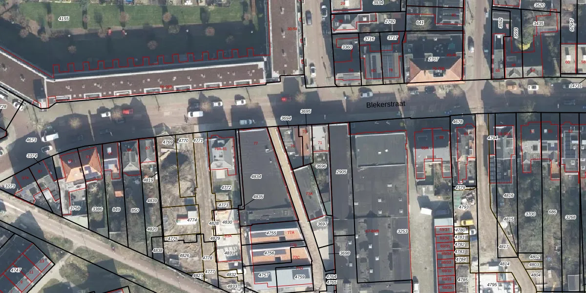 Het perceel waarop Blekerstraat 75 staat heeft een oppervlakte van 83 m². Dit is een klein perceel. De perceeloppervlakte wordt geregistreerd door het Kadaster. Gedetailleerde informatie over de maten van dit perceel kunt u vinden in het rapport Kadastrale kaart met maatvoering van Blekerstraat 75.