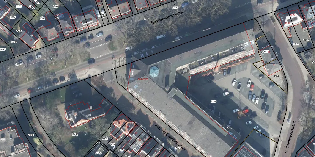 Het perceel waarop Boddenkampsingel 80-36 staat heeft een oppervlakte van 5705 m². Dit is een zeer groot perceel. De perceeloppervlakte wordt geregistreerd door het Kadaster. Gedetailleerde informatie over de maten van dit perceel kunt u vinden in het rapport Kadastrale kaart met maatvoering van Boddenkampsingel 80-36.