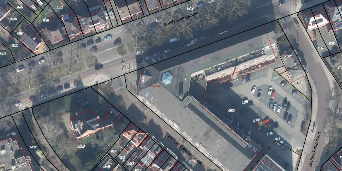 Het perceel waarop Boddenkampsingel 80-61 staat heeft een oppervlakte van 5705 m². Dit is een zeer groot perceel. De perceeloppervlakte wordt geregistreerd door het Kadaster. Gedetailleerde informatie over de maten van dit perceel kunt u vinden in het rapport Kadastrale kaart met maatvoering van Boddenkampsingel 80-61.
