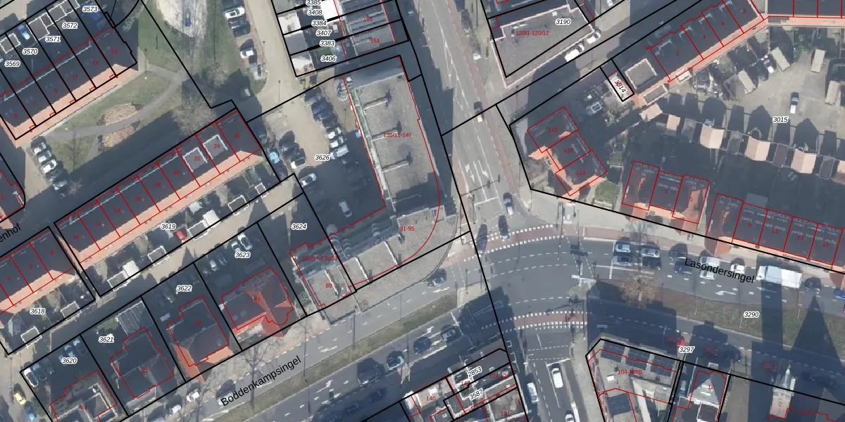 Boddenkampsingel 95 is gelegen op kadastraal perceel ESD00K3626. Deze kadastrale aanduiding is uniek en wordt gebruikt door het Kadaster om eigendomsrechten en andere zakelijke rechten vast te leggen. Het perceel maakt onderdeel uit van de kadastrale gemeente Enschede.
