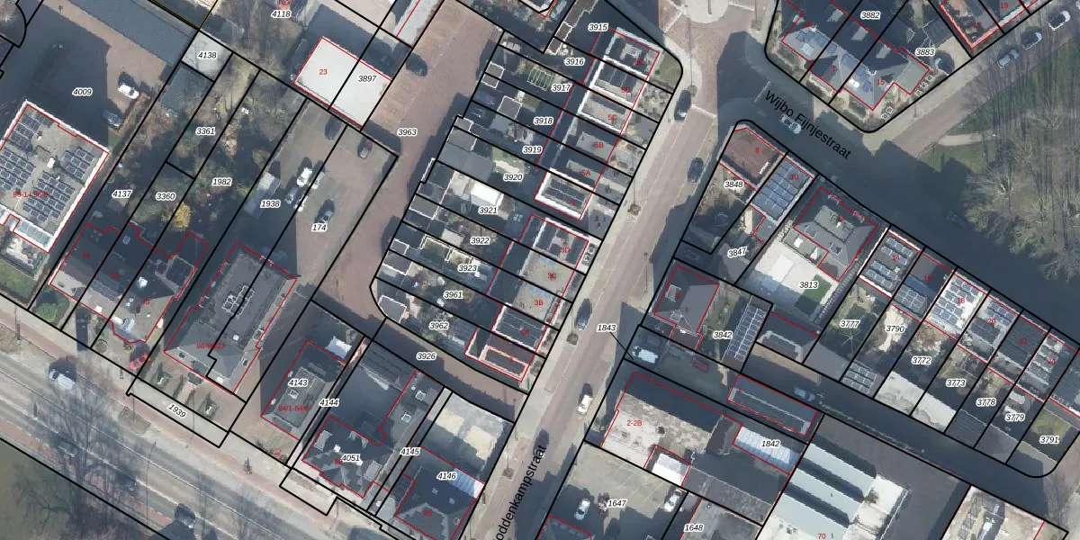 Gebruik de zoekbalk of klik op een perceel voor informatie over de adressen binnen dit perceel.