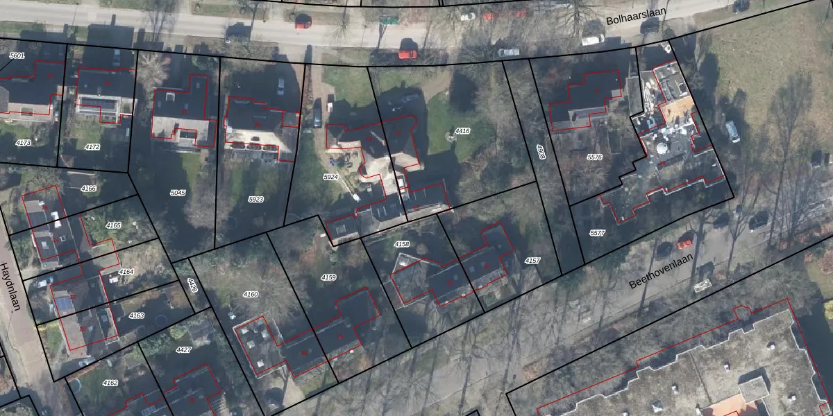Het perceel waarop Bolhaarslaan 15 staat heeft een oppervlakte van 1095 m². Dit is een zeer groot perceel. De perceeloppervlakte wordt geregistreerd door het Kadaster. Gedetailleerde informatie over de maten van dit perceel kunt u vinden in het rapport Kadastrale kaart met maatvoering van Bolhaarslaan 15.
