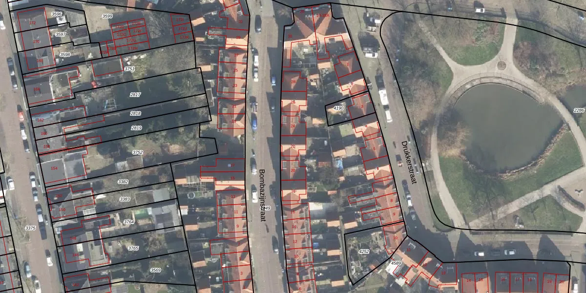 Het perceel waarop Bombazijnstraat 22 staat heeft een oppervlakte van 6975 m². Dit is een zeer groot perceel. De perceeloppervlakte wordt geregistreerd door het Kadaster. Gedetailleerde informatie over de maten van dit perceel kunt u vinden in het rapport Kadastrale kaart met maatvoering van Bombazijnstraat 22.