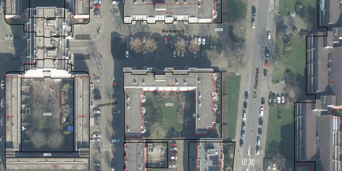 Het perceel waarop Bontweverij 162 staat heeft een oppervlakte van 2183 m². Dit is een zeer groot perceel. De perceeloppervlakte wordt geregistreerd door het Kadaster. Gedetailleerde informatie over de maten van dit perceel kunt u vinden in het rapport Kadastrale kaart met maatvoering van Bontweverij 162.