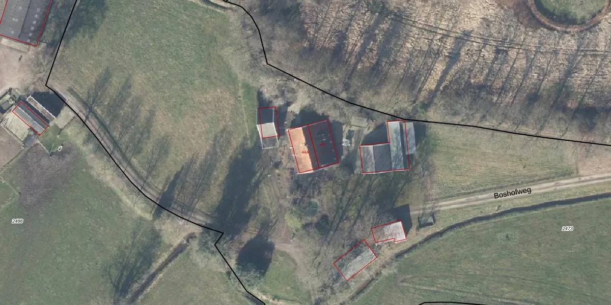 Het perceel waarop Boshofweg 44-A staat heeft een oppervlakte van 3,2 ha. Dit is een zeer groot perceel. De perceeloppervlakte wordt geregistreerd door het Kadaster. Gedetailleerde informatie over de maten van dit perceel kunt u vinden in het rapport Kadastrale kaart met maatvoering van Boshofweg 44-A.
