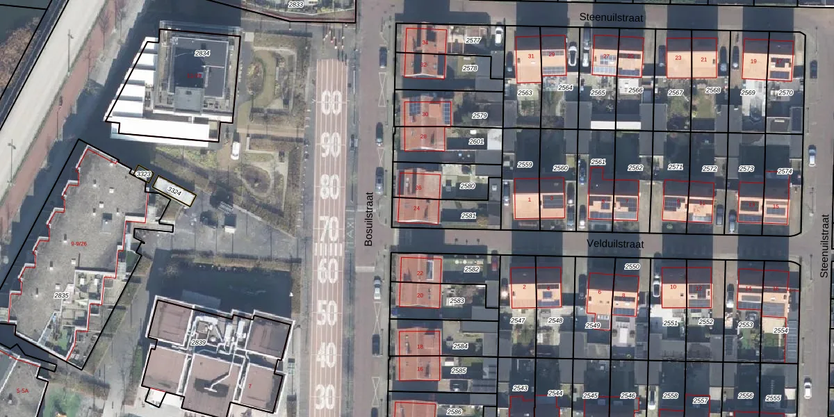 Gebruik de zoekbalk of klik op een perceel voor informatie over de adressen binnen dit perceel.