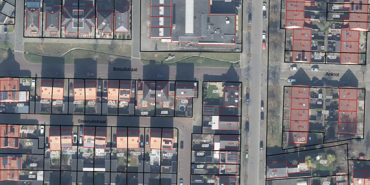 Gebruik de zoekbalk of klik op een perceel voor informatie over de adressen binnen dit perceel.