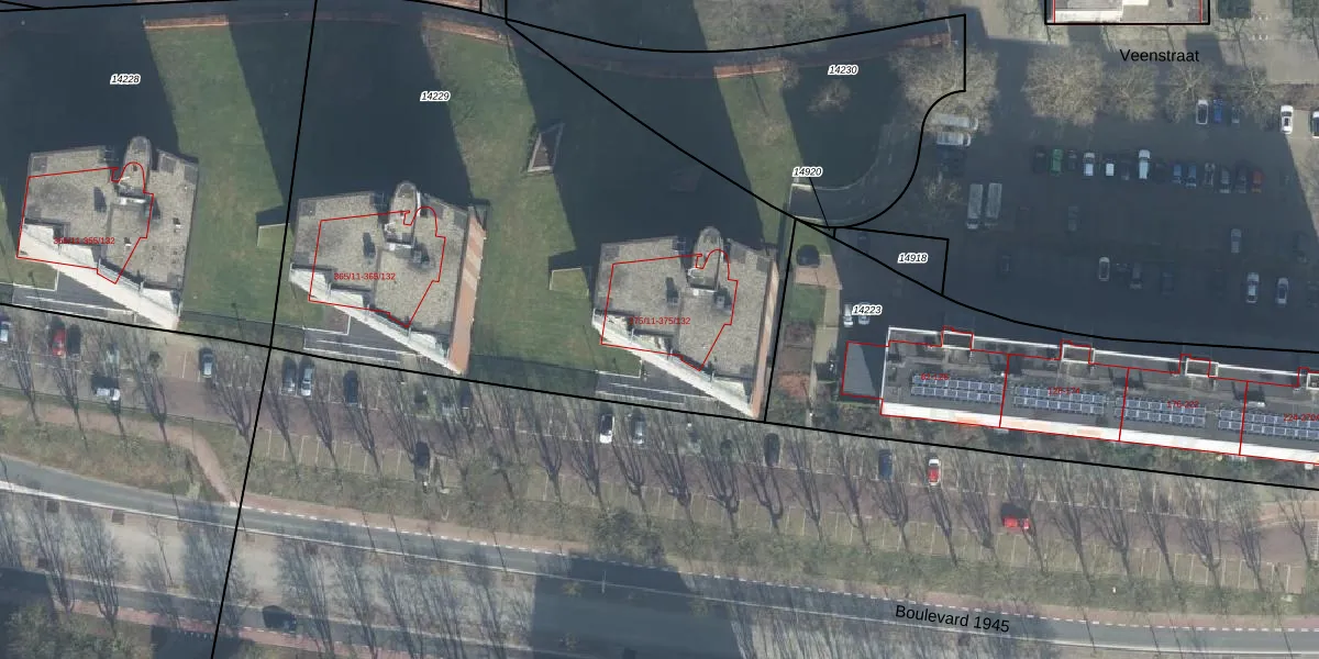 Het perceel waarop Boulevard 1945 375-71 staat heeft een oppervlakte van 3595 m². Dit is een zeer groot perceel. De perceeloppervlakte wordt geregistreerd door het Kadaster. Gedetailleerde informatie over de maten van dit perceel kunt u vinden in het rapport Kadastrale kaart met maatvoering van Boulevard 1945 375-71.