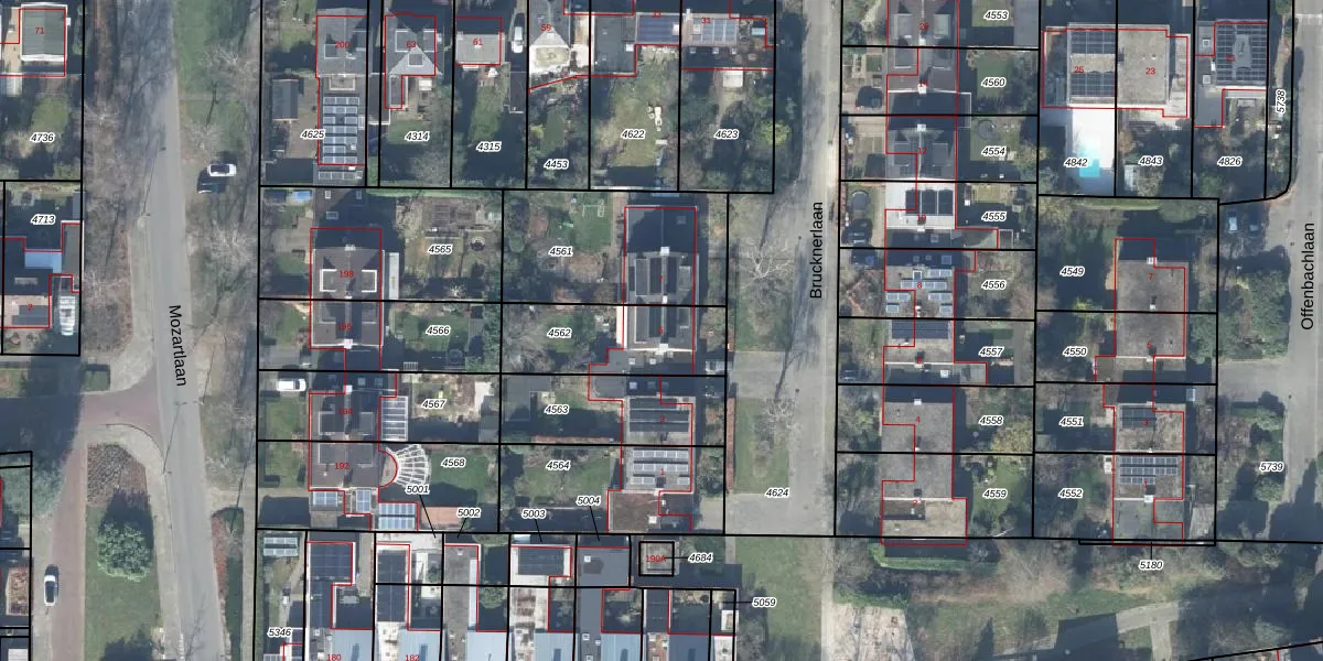 Het perceel waarop Brucknerlaan 5 staat heeft een oppervlakte van 361 m². Dit is een groot perceel. De perceeloppervlakte wordt geregistreerd door het Kadaster. Gedetailleerde informatie over de maten van dit perceel kunt u vinden in het rapport Kadastrale kaart met maatvoering van Brucknerlaan 5.