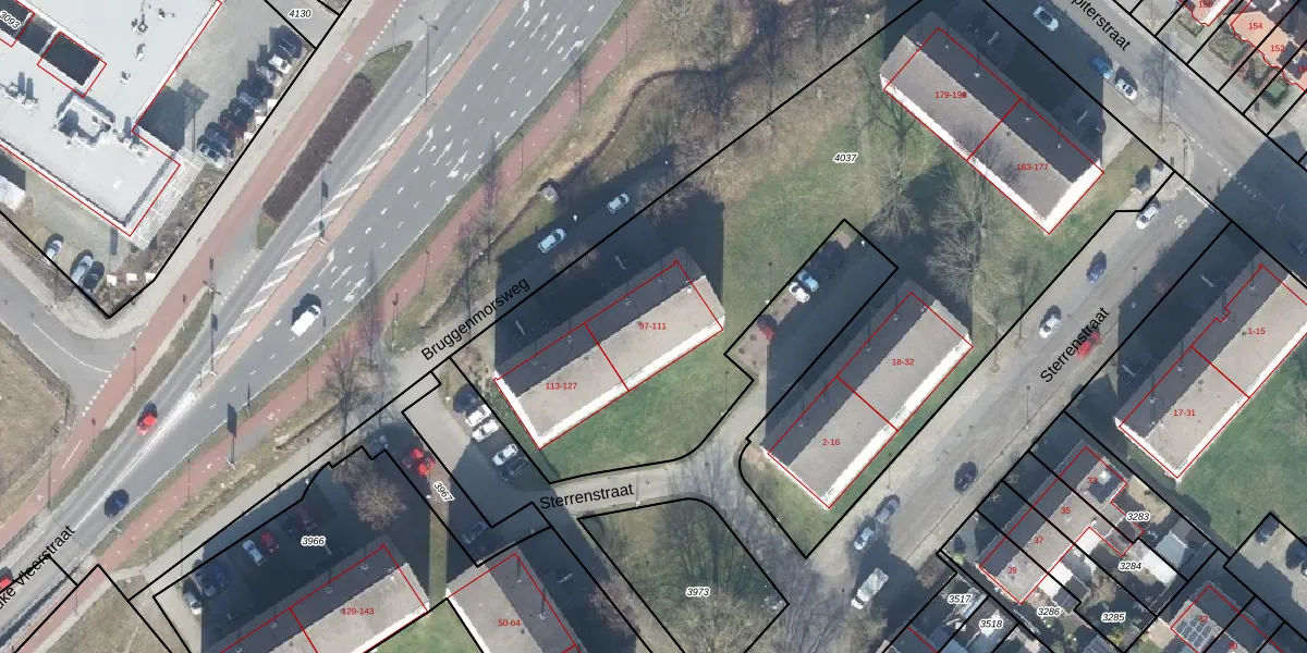 Het perceel waarop Bruggenmorsweg 101 staat heeft een oppervlakte van 4222 m². Dit is een zeer groot perceel. De perceeloppervlakte wordt geregistreerd door het Kadaster. Gedetailleerde informatie over de maten van dit perceel kunt u vinden in het rapport Kadastrale kaart met maatvoering van Bruggenmorsweg 101.