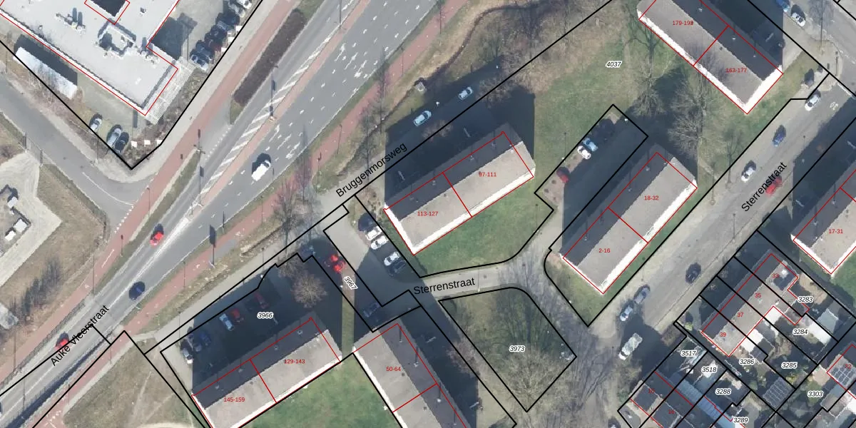 Het perceel waarop Bruggenmorsweg 127 staat heeft een oppervlakte van 4222 m². Dit is een zeer groot perceel. De perceeloppervlakte wordt geregistreerd door het Kadaster. Gedetailleerde informatie over de maten van dit perceel kunt u vinden in het rapport Kadastrale kaart met maatvoering van Bruggenmorsweg 127.