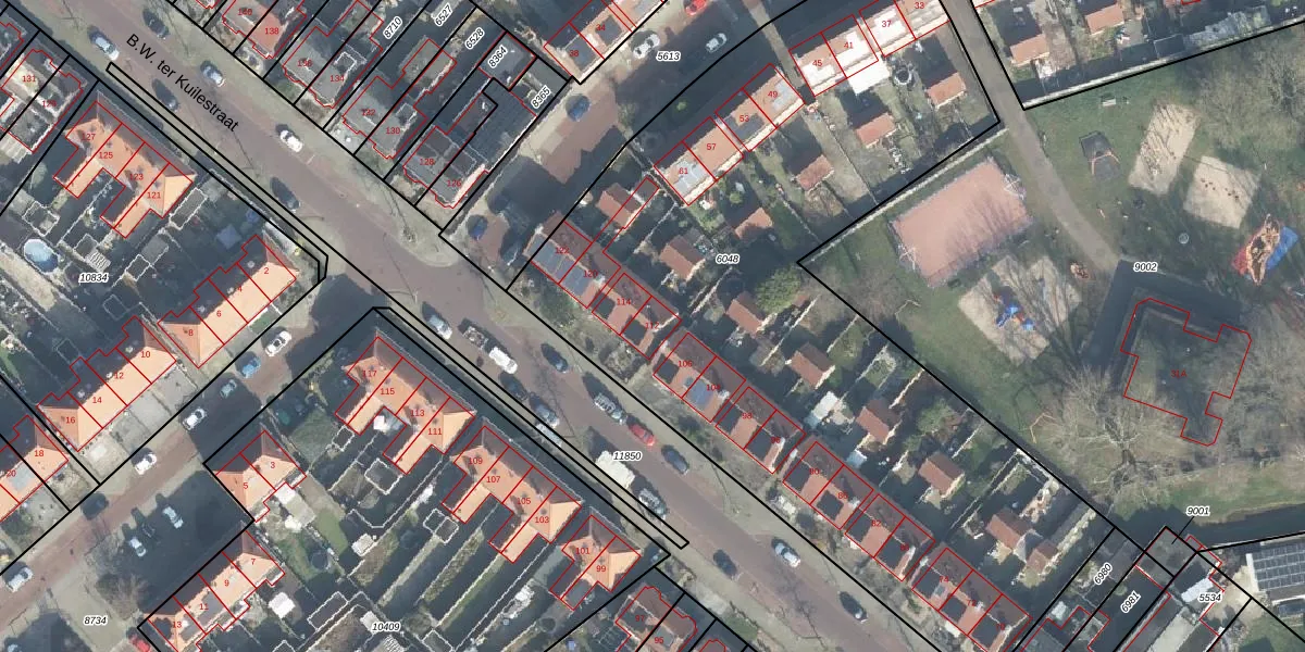 Het perceel waarop B.W. ter Kuilestraat 112 staat heeft een oppervlakte van 4447 m². Dit is een zeer groot perceel. De perceeloppervlakte wordt geregistreerd door het Kadaster. Gedetailleerde informatie over de maten van dit perceel kunt u vinden in het rapport Kadastrale kaart met maatvoering van B.W. ter Kuilestraat 112.