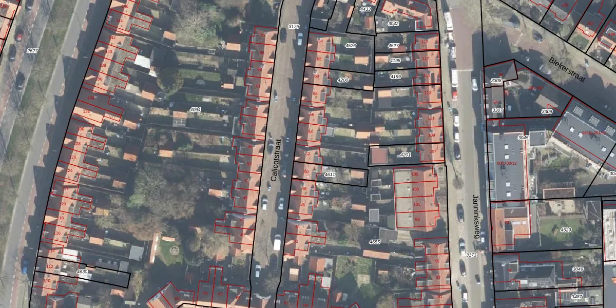 Het perceel waarop Calicotstraat 52 staat heeft een oppervlakte van 4501 m². Dit is een zeer groot perceel. De perceeloppervlakte wordt geregistreerd door het Kadaster. Gedetailleerde informatie over de maten van dit perceel kunt u vinden in het rapport Kadastrale kaart met maatvoering van Calicotstraat 52.
