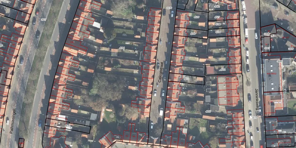 Calicotstraat 53 is gelegen op kadastraal perceel ESD00G4094. Deze kadastrale aanduiding is uniek en wordt gebruikt door het Kadaster om eigendomsrechten en andere zakelijke rechten vast te leggen. Het perceel maakt onderdeel uit van de kadastrale gemeente Enschede.