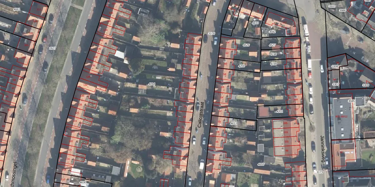 Het perceel waarop Calicotstraat 57 staat heeft een oppervlakte van 8551 m². Dit is een zeer groot perceel. De perceeloppervlakte wordt geregistreerd door het Kadaster. Gedetailleerde informatie over de maten van dit perceel kunt u vinden in het rapport Kadastrale kaart met maatvoering van Calicotstraat 57.