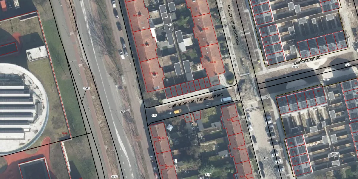 Het perceel waarop Catharina van Rennesstraat 3 staat heeft een oppervlakte van 4590 m². Dit is een zeer groot perceel. De perceeloppervlakte wordt geregistreerd door het Kadaster. Gedetailleerde informatie over de maten van dit perceel kunt u vinden in het rapport Kadastrale kaart met maatvoering van Catharina van Rennesstraat 3.