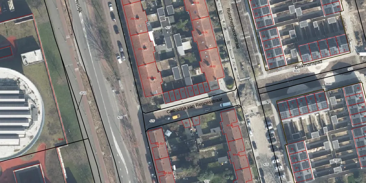 Het perceel waarop Catharina van Rennesstraat 4 staat heeft een oppervlakte van 4590 m². Dit is een zeer groot perceel. De perceeloppervlakte wordt geregistreerd door het Kadaster. Gedetailleerde informatie over de maten van dit perceel kunt u vinden in het rapport Kadastrale kaart met maatvoering van Catharina van Rennesstraat 4.