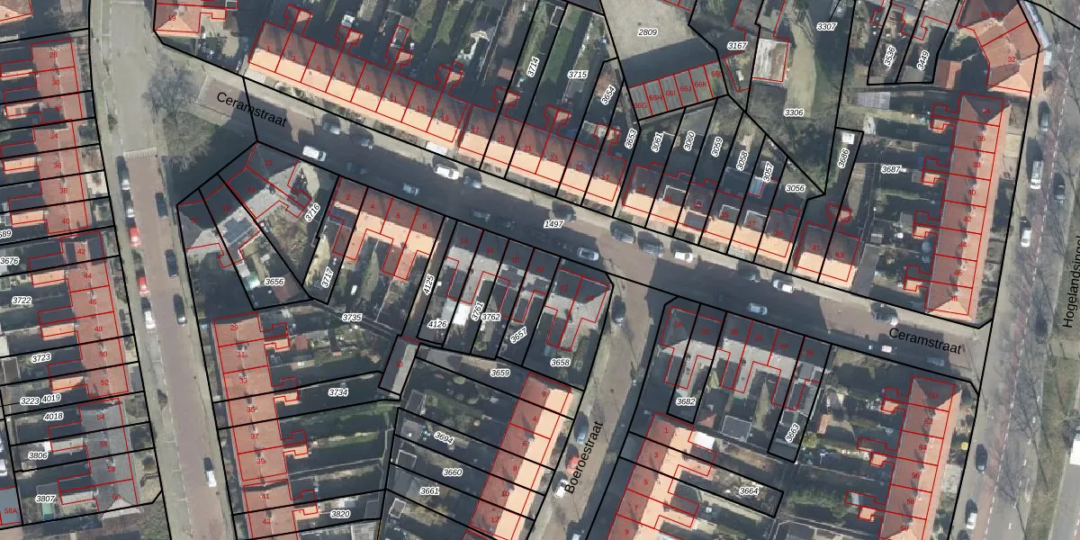 Het perceel waarop Ceramstraat 20 staat heeft een oppervlakte van 108 m². Dit is een middelgroot perceel. De perceeloppervlakte wordt geregistreerd door het Kadaster. Gedetailleerde informatie over de maten van dit perceel kunt u vinden in het rapport Kadastrale kaart met maatvoering van Ceramstraat 20.