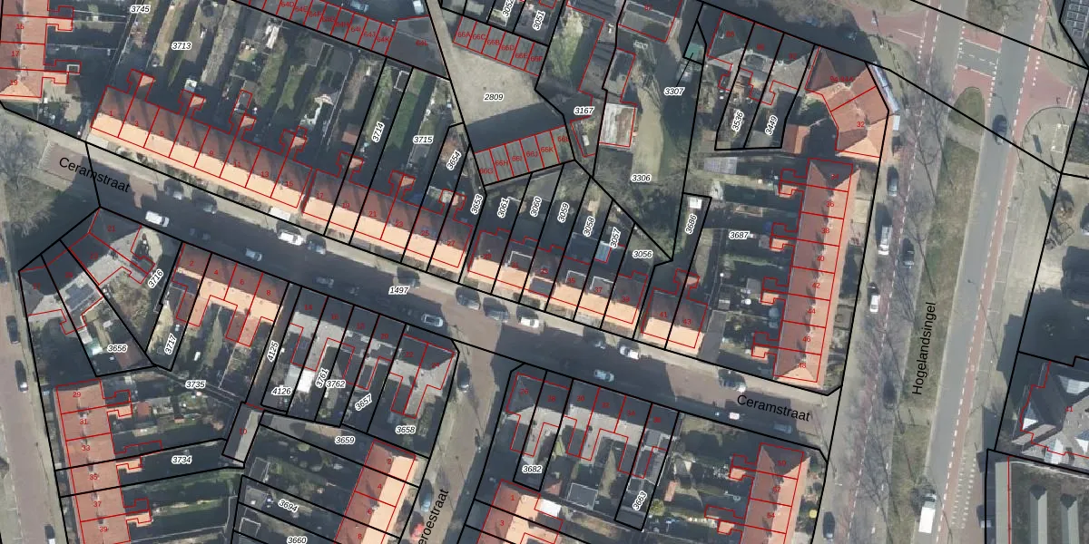 Het perceel waarop Ceramstraat 33 staat heeft een oppervlakte van 143 m². Dit is een middelgroot perceel. De perceeloppervlakte wordt geregistreerd door het Kadaster. Gedetailleerde informatie over de maten van dit perceel kunt u vinden in het rapport Kadastrale kaart met maatvoering van Ceramstraat 33.