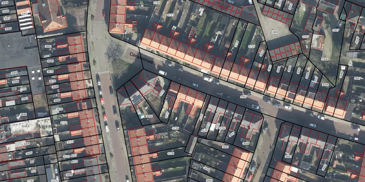 Het perceel waarop Ceramstraat 4 staat heeft een oppervlakte van 1014 m². Dit is een zeer groot perceel. De perceeloppervlakte wordt geregistreerd door het Kadaster. Gedetailleerde informatie over de maten van dit perceel kunt u vinden in het rapport Kadastrale kaart met maatvoering van Ceramstraat 4.