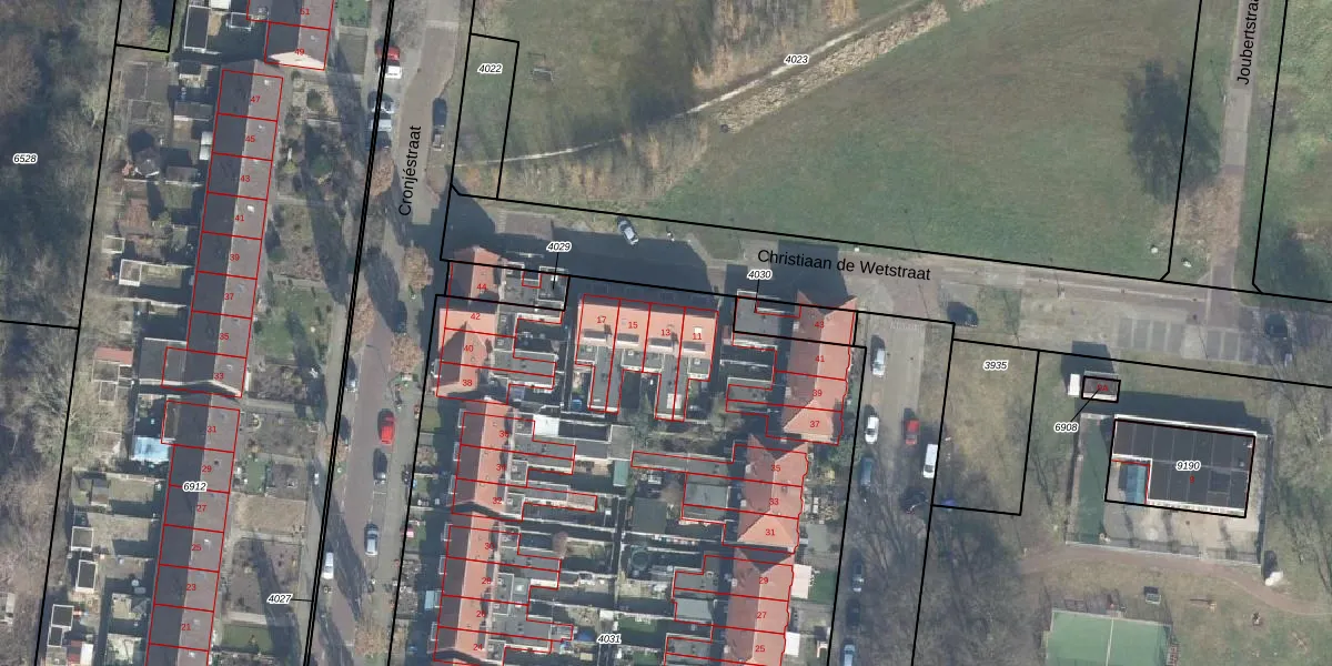 Het perceel waarop Christiaan de Wetstraat 13 staat heeft een oppervlakte van 7515 m². Dit is een zeer groot perceel. De perceeloppervlakte wordt geregistreerd door het Kadaster. Gedetailleerde informatie over de maten van dit perceel kunt u vinden in het rapport Kadastrale kaart met maatvoering van Christiaan de Wetstraat 13.