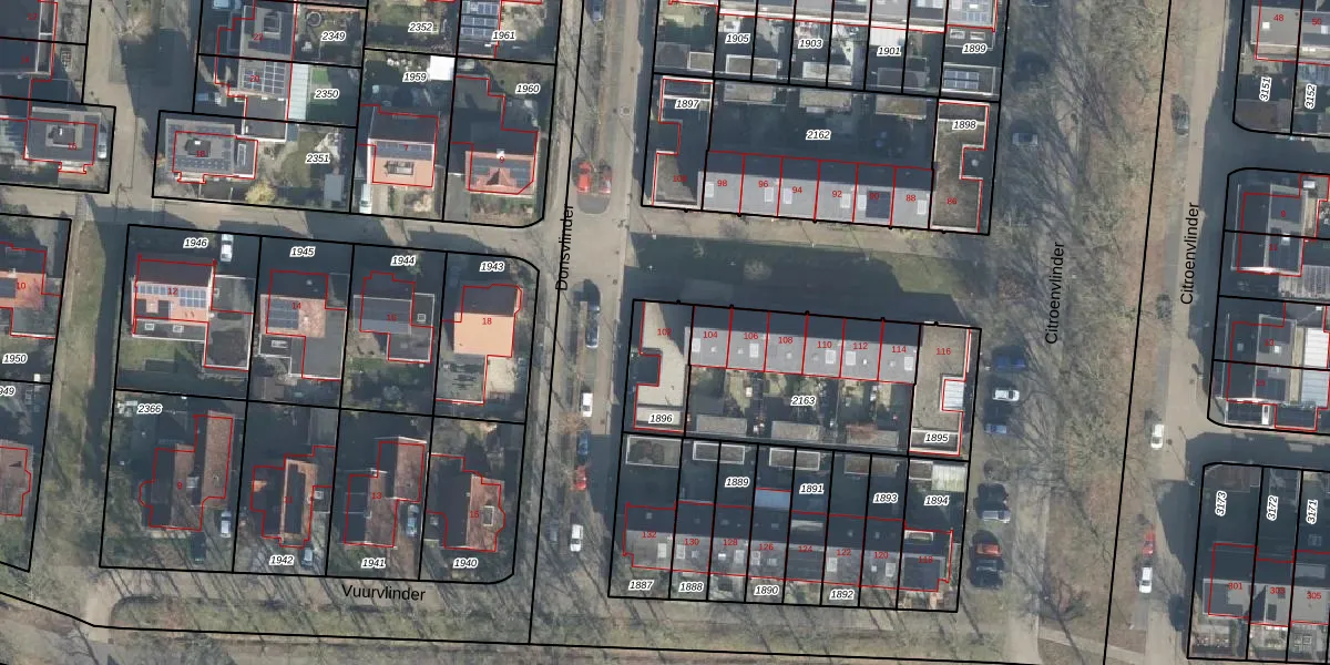 Het perceel waarop Citroenvlinder 102 staat heeft een oppervlakte van 185 m². Dit is een middelgroot perceel. De perceeloppervlakte wordt geregistreerd door het Kadaster. Gedetailleerde informatie over de maten van dit perceel kunt u vinden in het rapport Kadastrale kaart met maatvoering van Citroenvlinder 102.