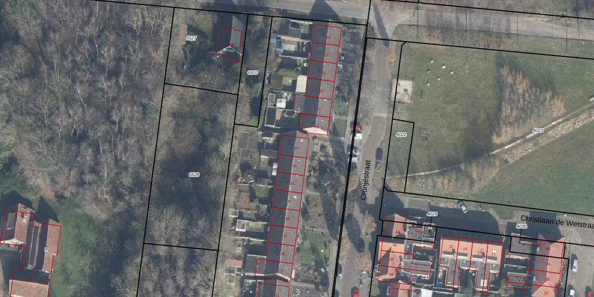 Het perceel waarop Cronjéstraat 47 staat heeft een oppervlakte van 6843 m². Dit is een zeer groot perceel. De perceeloppervlakte wordt geregistreerd door het Kadaster. Gedetailleerde informatie over de maten van dit perceel kunt u vinden in het rapport Kadastrale kaart met maatvoering van Cronjéstraat 47.