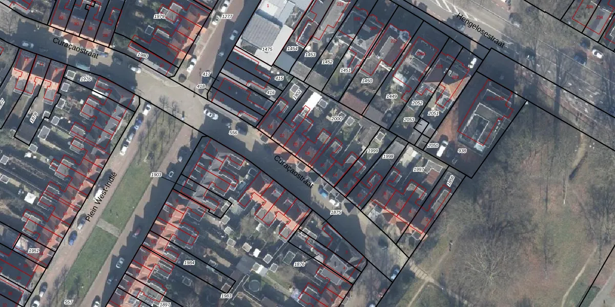 Het perceel waarop Curaçaostraat 18 staat heeft een oppervlakte van 612 m². Dit is een groot perceel. De perceeloppervlakte wordt geregistreerd door het Kadaster. Gedetailleerde informatie over de maten van dit perceel kunt u vinden in het rapport Kadastrale kaart met maatvoering van Curaçaostraat 18.