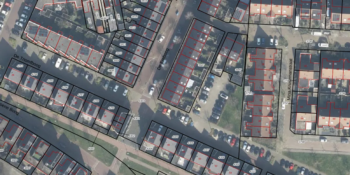 Het perceel waarop De Ereboog 39 staat heeft een oppervlakte van 994 m². Dit is een groot perceel. De perceeloppervlakte wordt geregistreerd door het Kadaster. Gedetailleerde informatie over de maten van dit perceel kunt u vinden in het rapport Kadastrale kaart met maatvoering van De Ereboog 39.