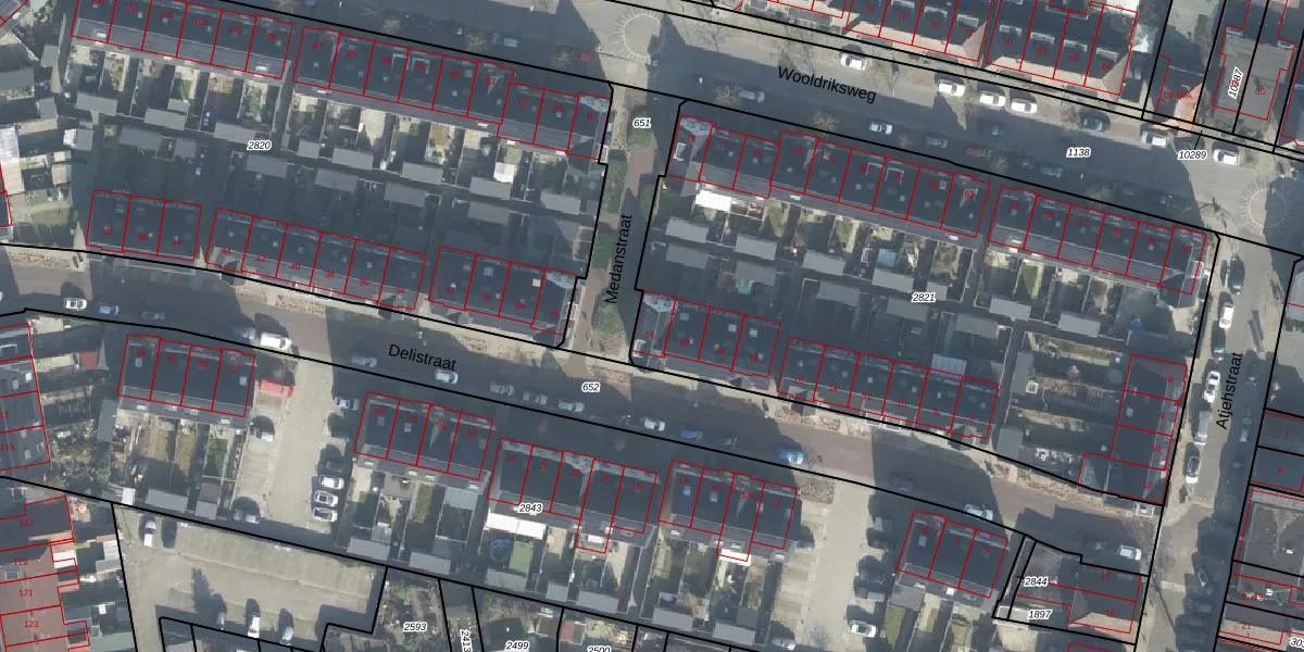 Het perceel waarop Delistraat 24 staat heeft een oppervlakte van 3590 m². Dit is een zeer groot perceel. De perceeloppervlakte wordt geregistreerd door het Kadaster. Gedetailleerde informatie over de maten van dit perceel kunt u vinden in het rapport Kadastrale kaart met maatvoering van Delistraat 24.