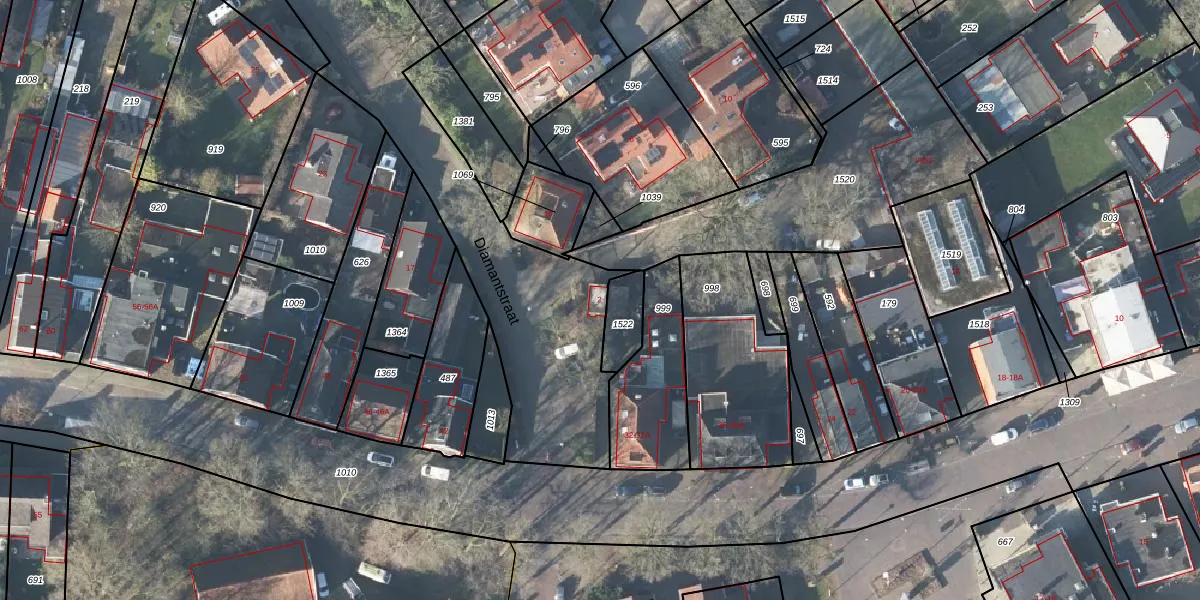 Het perceel waarop Diamantstraat 2 staat heeft een oppervlakte van 9476 m². Dit is een zeer groot perceel. De perceeloppervlakte wordt geregistreerd door het Kadaster. Gedetailleerde informatie over de maten van dit perceel kunt u vinden in het rapport Kadastrale kaart met maatvoering van Diamantstraat 2.