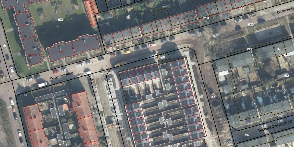Het perceel waarop Diekmanstraat 18 staat heeft een oppervlakte van 3793 m². Dit is een zeer groot perceel. De perceeloppervlakte wordt geregistreerd door het Kadaster. Gedetailleerde informatie over de maten van dit perceel kunt u vinden in het rapport Kadastrale kaart met maatvoering van Diekmanstraat 18.