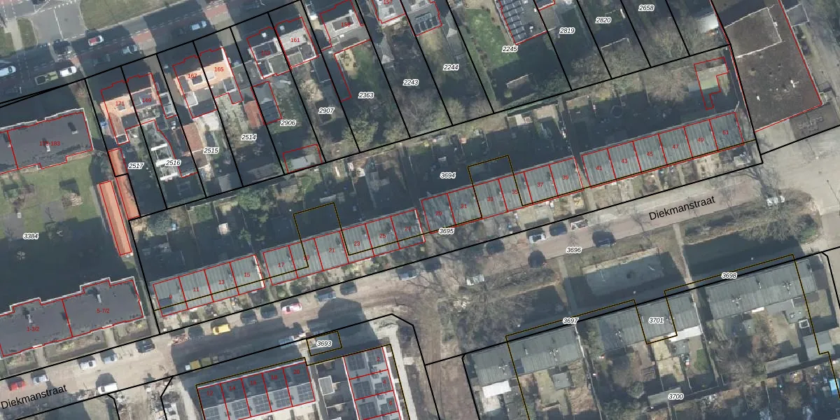 Het perceel waarop Diekmanstraat 29 staat heeft een oppervlakte van 3109 m². Dit is een zeer groot perceel. De perceeloppervlakte wordt geregistreerd door het Kadaster. Gedetailleerde informatie over de maten van dit perceel kunt u vinden in het rapport Kadastrale kaart met maatvoering van Diekmanstraat 29.