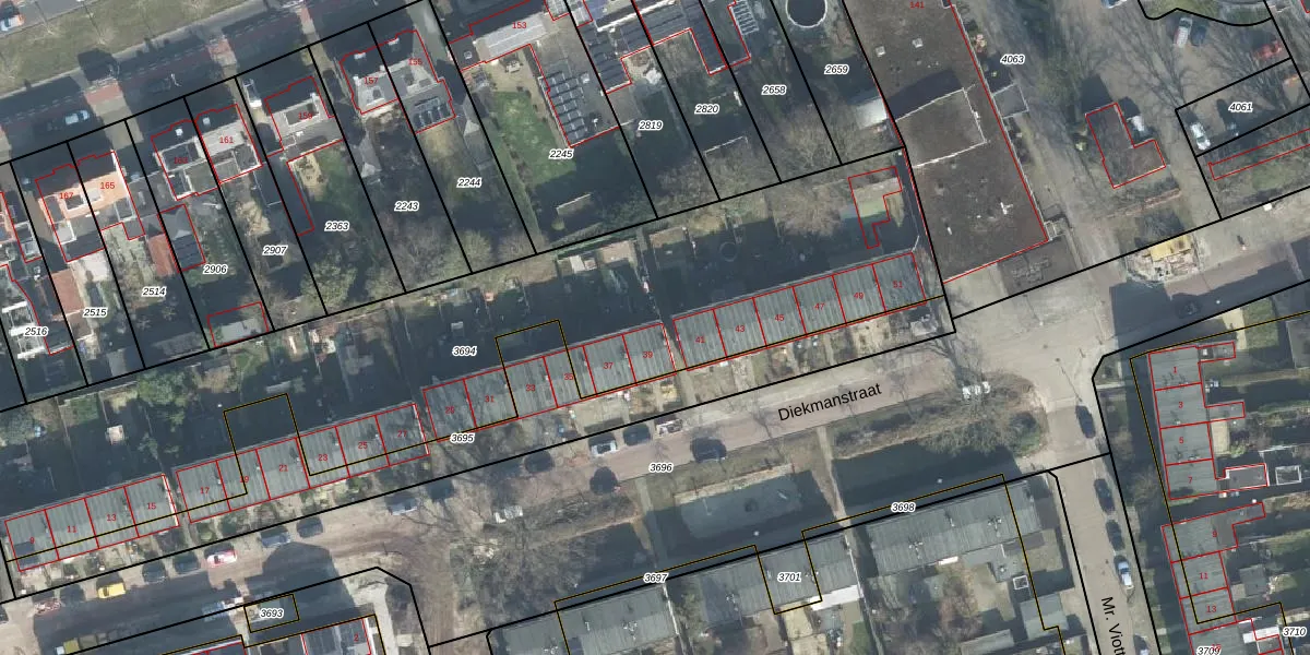 Het perceel waarop Diekmanstraat 39 staat heeft een oppervlakte van 3109 m². Dit is een zeer groot perceel. De perceeloppervlakte wordt geregistreerd door het Kadaster. Gedetailleerde informatie over de maten van dit perceel kunt u vinden in het rapport Kadastrale kaart met maatvoering van Diekmanstraat 39.