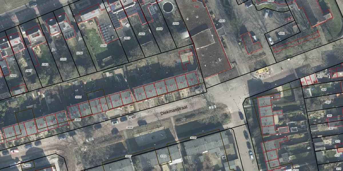Het perceel waarop Diekmanstraat 47 staat heeft een oppervlakte van 3109 m². Dit is een zeer groot perceel. De perceeloppervlakte wordt geregistreerd door het Kadaster. Gedetailleerde informatie over de maten van dit perceel kunt u vinden in het rapport Kadastrale kaart met maatvoering van Diekmanstraat 47.