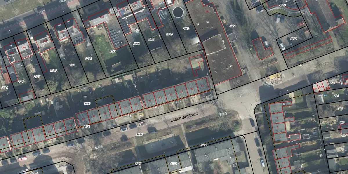 Het perceel waarop Diekmanstraat 47 staat heeft een oppervlakte van 3109 m². Dit is een zeer groot perceel. De perceeloppervlakte wordt geregistreerd door het Kadaster. Gedetailleerde informatie over de maten van dit perceel kunt u vinden in het rapport Kadastrale kaart met maatvoering van Diekmanstraat 47.
