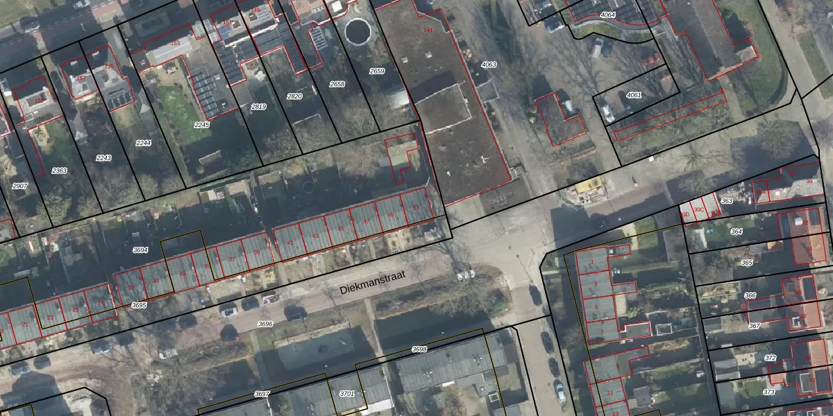 Het perceel waarop Diekmanstraat 51 staat heeft een oppervlakte van 3109 m². Dit is een zeer groot perceel. De perceeloppervlakte wordt geregistreerd door het Kadaster. Gedetailleerde informatie over de maten van dit perceel kunt u vinden in het rapport Kadastrale kaart met maatvoering van Diekmanstraat 51.
