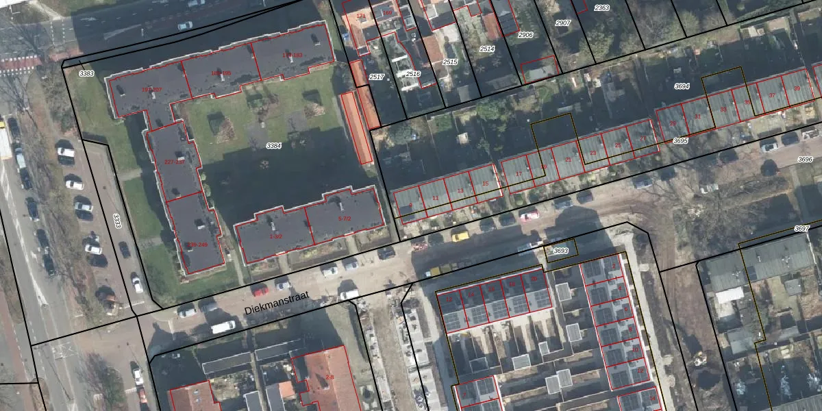 Het perceel waarop Diekmanstraat 9 staat heeft een oppervlakte van 3109 m². Dit is een zeer groot perceel. De perceeloppervlakte wordt geregistreerd door het Kadaster. Gedetailleerde informatie over de maten van dit perceel kunt u vinden in het rapport Kadastrale kaart met maatvoering van Diekmanstraat 9.