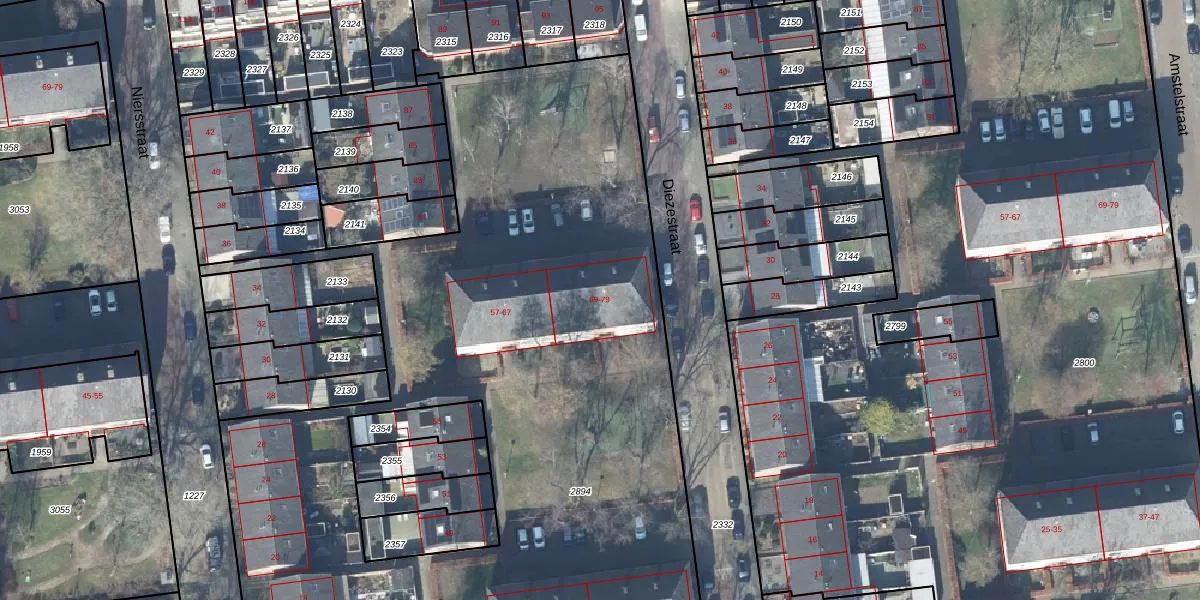 Het perceel waarop Diezestraat 71 staat heeft een oppervlakte van 9972 m². Dit is een zeer groot perceel. De perceeloppervlakte wordt geregistreerd door het Kadaster. Gedetailleerde informatie over de maten van dit perceel kunt u vinden in het rapport Kadastrale kaart met maatvoering van Diezestraat 71.