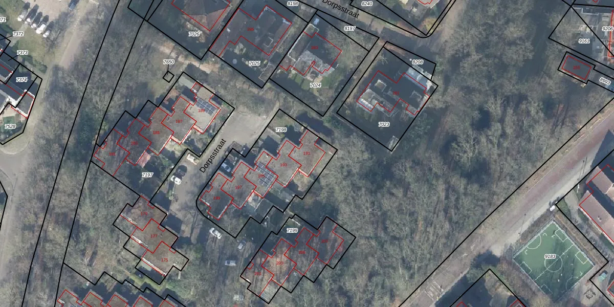 Het perceel waarop Dorpsstraat 191 staat heeft een oppervlakte van 950 m². Dit is een groot perceel. De perceeloppervlakte wordt geregistreerd door het Kadaster. Gedetailleerde informatie over de maten van dit perceel kunt u vinden in het rapport Kadastrale kaart met maatvoering van Dorpsstraat 191.