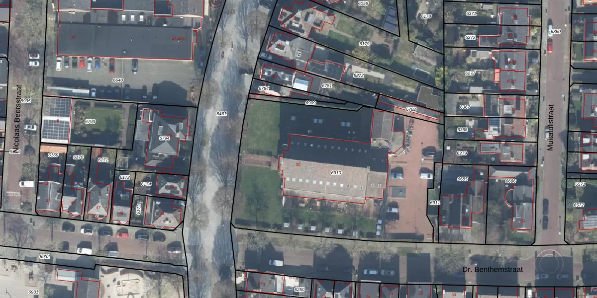 Het perceel waarop Dr. Benthemstraat 53-8 staat heeft een oppervlakte van 2833 m². Dit is een zeer groot perceel. De perceeloppervlakte wordt geregistreerd door het Kadaster. Gedetailleerde informatie over de maten van dit perceel kunt u vinden in het rapport Kadastrale kaart met maatvoering van Dr. Benthemstraat 53-8.