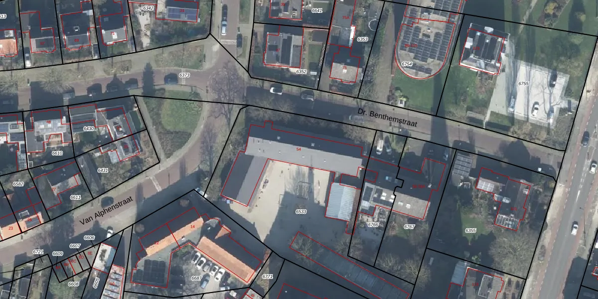 Dr. Benthemstraat 54 is gelegen op kadastraal perceel ESD00C6533. Deze kadastrale aanduiding is uniek en wordt gebruikt door het Kadaster om eigendomsrechten en andere zakelijke rechten vast te leggen. Het perceel maakt onderdeel uit van de kadastrale gemeente Enschede.
