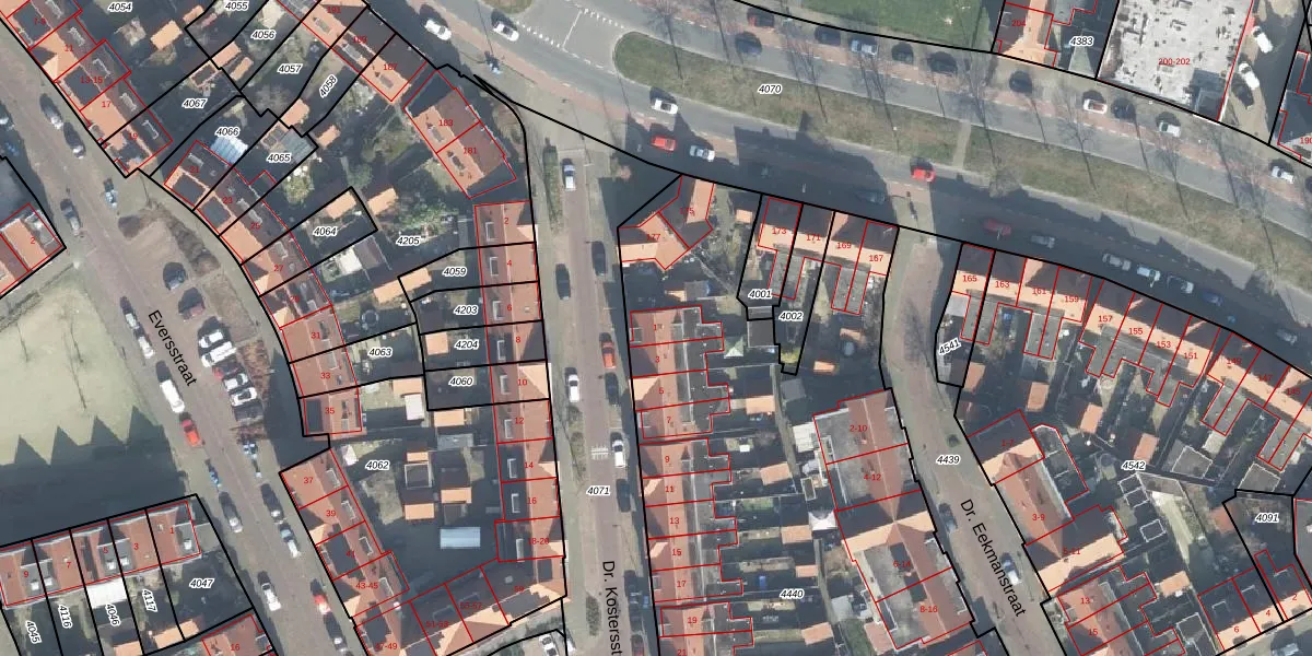 Dr. Kostersstraat 1 is gelegen op kadastraal perceel ESD00G4440. Deze kadastrale aanduiding is uniek en wordt gebruikt door het Kadaster om eigendomsrechten en andere zakelijke rechten vast te leggen. Het perceel maakt onderdeel uit van de kadastrale gemeente Enschede.