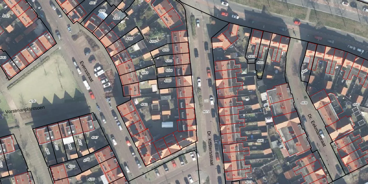 Dr. Kostersstraat 12 is gelegen op kadastraal perceel ESD00G4062. Deze kadastrale aanduiding is uniek en wordt gebruikt door het Kadaster om eigendomsrechten en andere zakelijke rechten vast te leggen. Het perceel maakt onderdeel uit van de kadastrale gemeente Enschede.