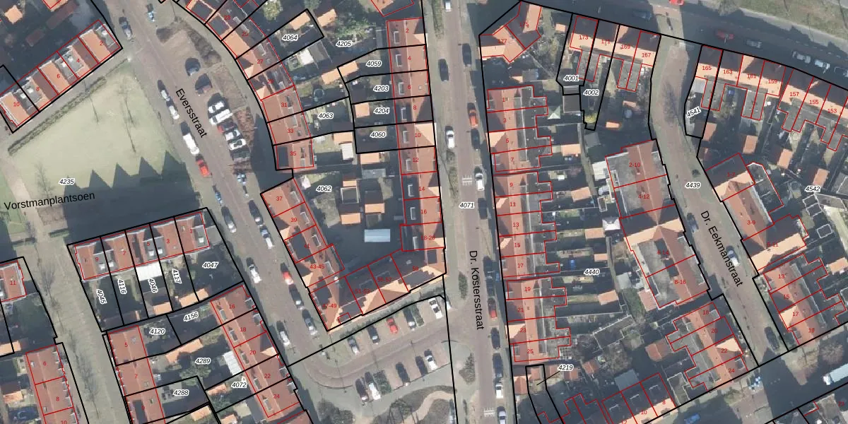 Dr. Kostersstraat 16 is gelegen op kadastraal perceel ESD00G4062. Deze kadastrale aanduiding is uniek en wordt gebruikt door het Kadaster om eigendomsrechten en andere zakelijke rechten vast te leggen. Het perceel maakt onderdeel uit van de kadastrale gemeente Enschede.