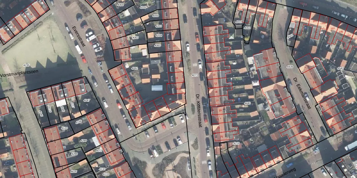 Dr. Kostersstraat 18 is gelegen op kadastraal perceel ESD00G4062. Deze kadastrale aanduiding is uniek en wordt gebruikt door het Kadaster om eigendomsrechten en andere zakelijke rechten vast te leggen. Het perceel maakt onderdeel uit van de kadastrale gemeente Enschede.