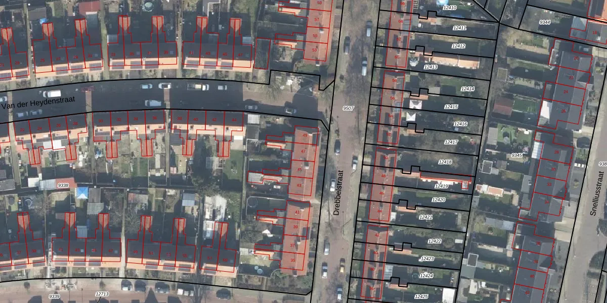 Het perceel waarop Drebbelstraat 47 staat heeft een oppervlakte van 9019 m². Dit is een zeer groot perceel. De perceeloppervlakte wordt geregistreerd door het Kadaster. Gedetailleerde informatie over de maten van dit perceel kunt u vinden in het rapport Kadastrale kaart met maatvoering van Drebbelstraat 47.