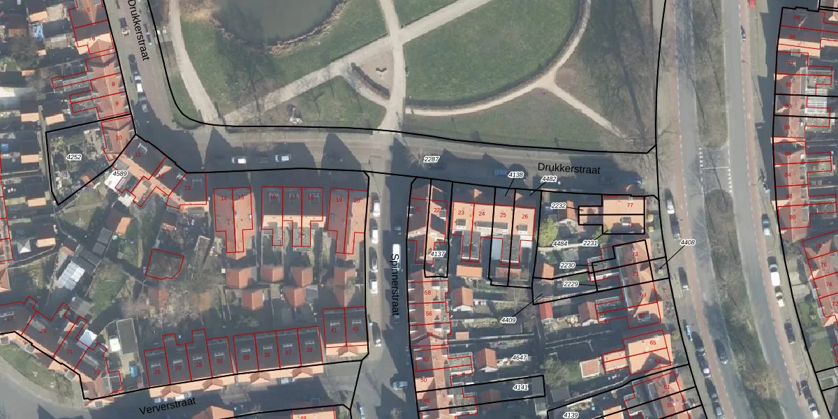 Het perceel waarop Drukkerstraat 21 staat heeft een oppervlakte van 2768 m². Dit is een zeer groot perceel. De perceeloppervlakte wordt geregistreerd door het Kadaster. Gedetailleerde informatie over de maten van dit perceel kunt u vinden in het rapport Kadastrale kaart met maatvoering van Drukkerstraat 21.