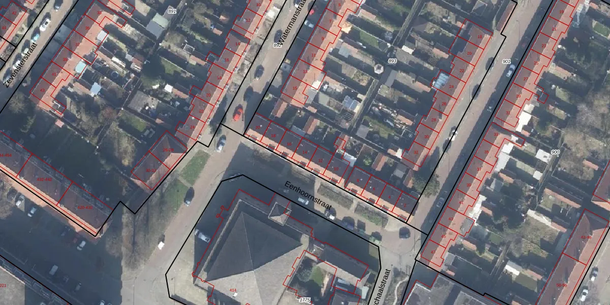 Het perceel waarop Eenhoornstraat 14 staat heeft een oppervlakte van 5430 m². Dit is een zeer groot perceel. De perceeloppervlakte wordt geregistreerd door het Kadaster. Gedetailleerde informatie over de maten van dit perceel kunt u vinden in het rapport Kadastrale kaart met maatvoering van Eenhoornstraat 14.