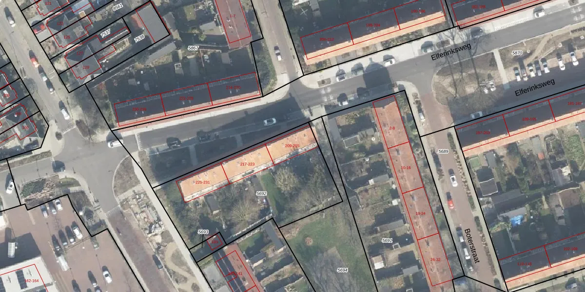 Elferinksweg 215 is gelegen op kadastraal perceel LNK00N5692. Deze kadastrale aanduiding is uniek en wordt gebruikt door het Kadaster om eigendomsrechten en andere zakelijke rechten vast te leggen. Het perceel maakt onderdeel uit van de kadastrale gemeente Lonneker.